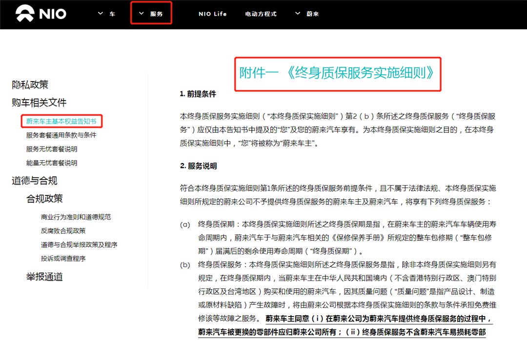 有关蔚来详尽的终身质保政策细则,大家可以浏览蔚来的官方网站中NIO Service的蔚来车主基本权益告知书。当中详细介绍包括了前提条件、服务说明、除外情形、终止情形、其他约定五个方面。