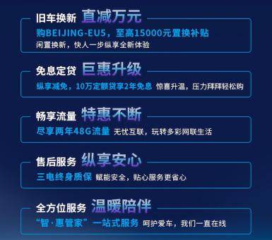 为回馈用户长期以来的支持,2020款BEIJING-EU5提供至高15000元置换补贴、2年免息定额贷、三电终身质保、2年48G流量以及“智·惠管家”一站式服务等五重钜惠福利,让用户轻松开驶美好车生活。