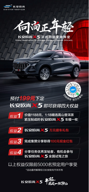 作为一款全面链接年轻人的全新价值产品,长安欧尚X5为极致而生,也将与年轻的后浪们一起追逐不息,奔涌向前!长安欧尚汽车致力于将最极致的产品带给用户,以年轻超感的运动风潮,让更多人不负期待。