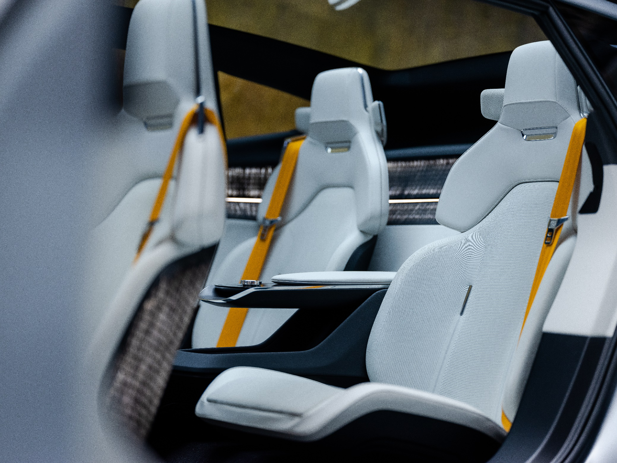 极星Precept的内饰采用了多种创新环保材料,包括可回收的PET塑料瓶、渔网和软木纤维。我们外部合作伙伴Bcomp公司提供的天然亚麻纤维复合材料,应用于Precept的内饰面板和座椅背板 。未来,这些可持续发展的材料将大部分投入量产。
