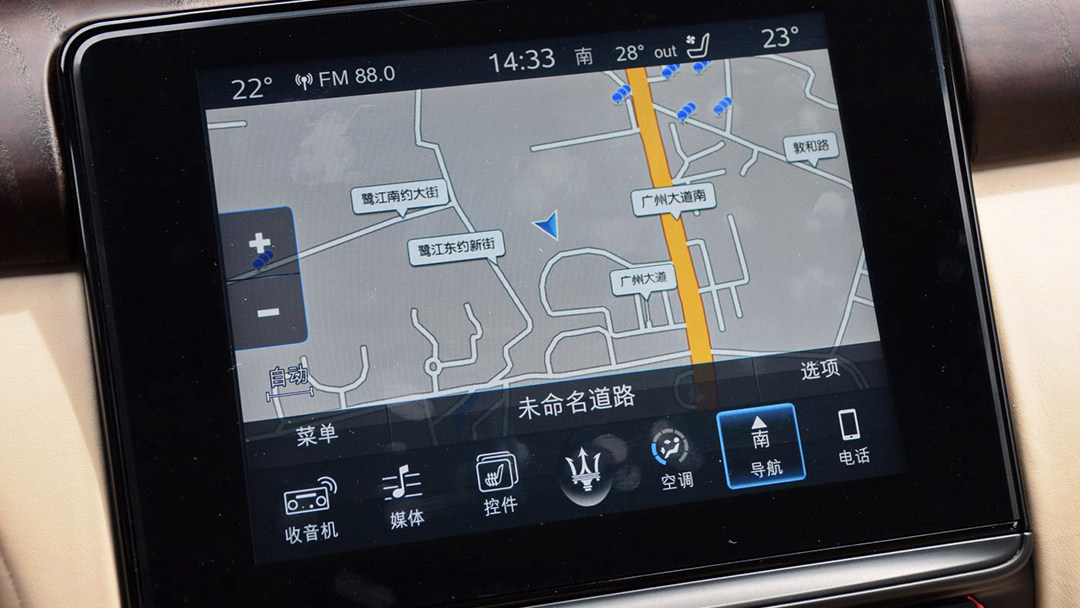 这块8.4英寸中控触摸屏拥有惊人的黑框,加上它“落伍”的UI设计风格,使其看上去很难让人相信这是属于一款百万豪车的车机。