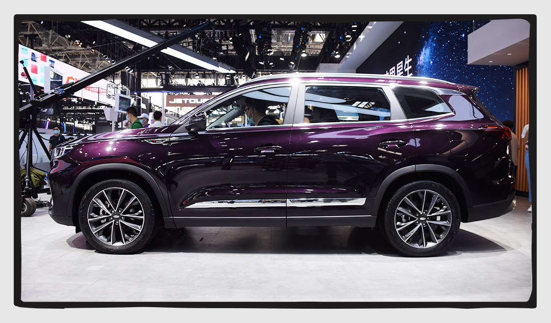 为了照顾大空间,车辆侧面会比较厚重,而且窗线不算高,整体来看是以实用为主要需求;双腰线的设计让本来厚重的侧面变得更加多层次些,视觉效果中规中矩。紫色的车漆在灯光效果下特别有质感、特别显线条,如果对瑞虎8 PLUS有兴趣的,不妨考虑一下这个颜色。
