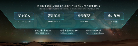 “M”,意指火星Mars,见证着人类对未知的无尽探索;“3”生万物,代表星途产品的多元衍生性;“X”则预示无限可能。M3X火星架构采用国际领先的模块化构建理念,具备极强衍生能力,兼容A~C级SUV/轿车/MPV及新能源车型,并由安全星云、智汇星河、舒享星空和动力星核四大核心优势模块架构而成。四大模块可分别进行优化,从而确保架构本身不断进化和发展,构建起EXEED星途孕育更多高品质、高性能、高价值产品的智慧载体。