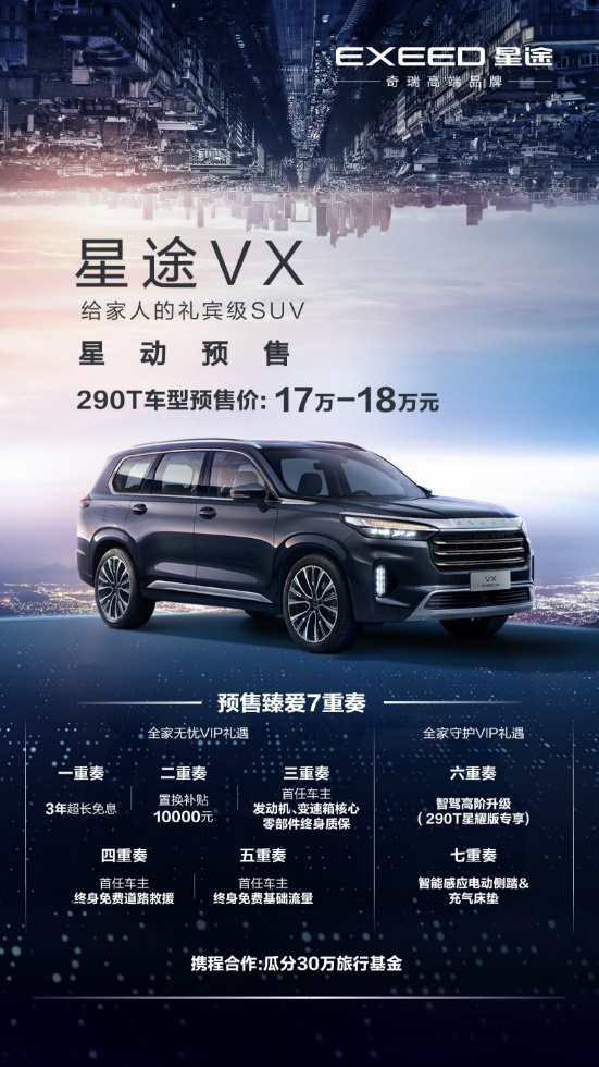 星途VX 290T车型现已正式开启预售,价格区间为:17万元~18万元。EXEED星途同样为消费者准备了礼宾级的臻爱七重奏,用户在预售期间下定,即可专享全家无忧VIP礼遇:“首任车主免费道路救援”、“首任车主发动机和变速箱核心零部件终身质保”、“首任车主免费基础流量”、“3年超长免息”、“万元置换补贴”,和全家守护VIP礼遇:“智能驾驶高阶升级礼包”、“智能感应电动侧踏和充气床垫”。