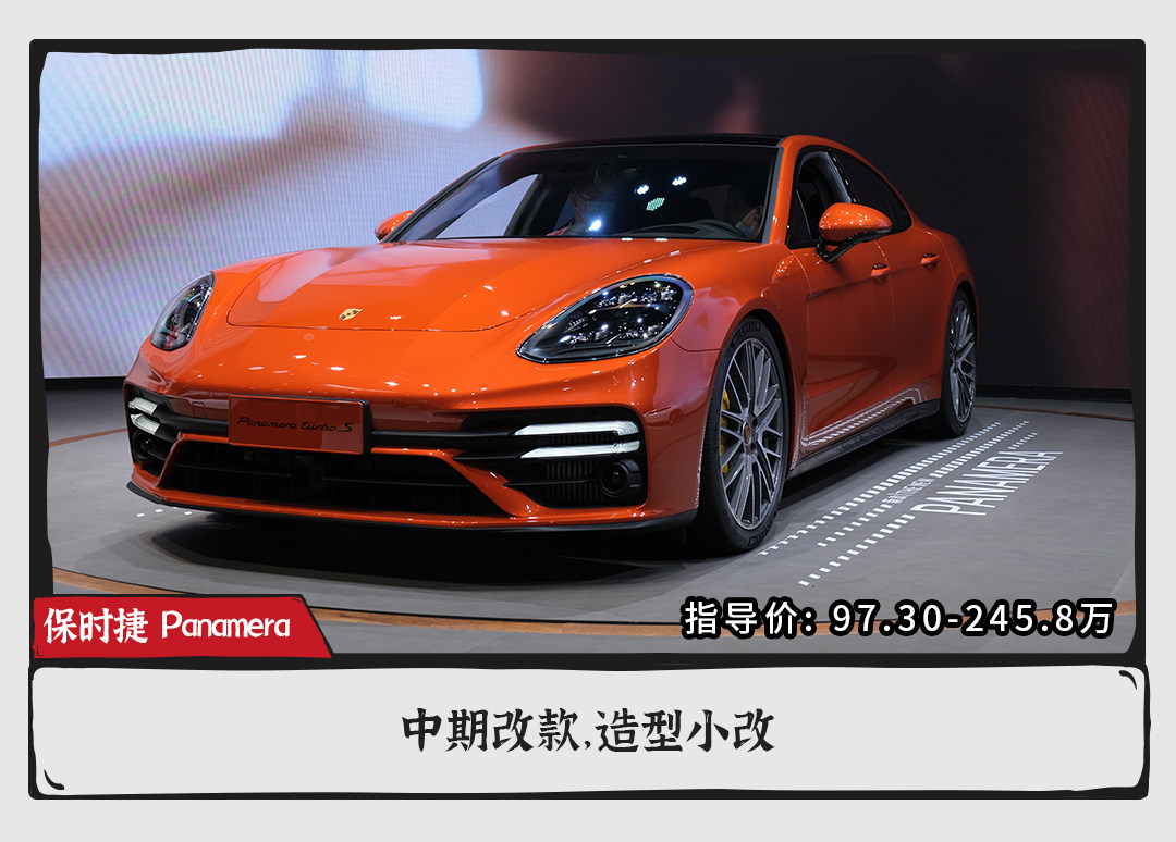 新款保时捷Panamera在外观部分最容易识别的就是标配Sport Design前脸,此前该前脸是作为选装提供的。作为中期改款,侧面设计没有大调整,但是保时捷为新车提供了新轮圈,包括20英寸轮圈和两款21英寸轮圈,以及21英寸Exclusive Design轻合金轮圈。车身尾部最主要的改变在于尾灯,新车会提供Exclusive Design尾灯组。虽然在整体轮廓上没有太大变化,但内部灯带的形状进行新的设计。
