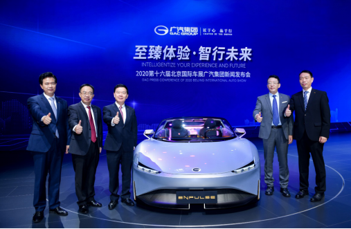 广汽集团董事长曾庆洪(左三)、广汽集团总经理冯兴亚(右二)、广汽乘用车总经理张跃赛(左二)、广汽研究院院长吴坚(右一)、广汽新能源总经理古惠南(左一)与概念车影动(ENPULSE)合影