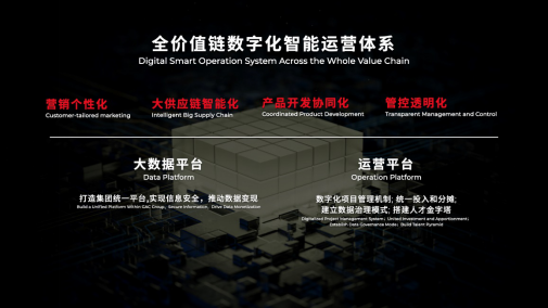 在两大平台的强力支撑下达成“四化”,即营销个性化、大供应链智能化、产品开发协同化和管控透明化。