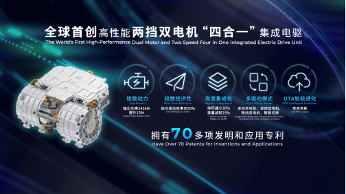 广汽新能源发布全球首创高性能两挡双电机“四合一”集成电驱。通过双电机+控制器+两挡减速器深度集成,在“三合一”电驱基础上实现再次升级,带来340KW狂暴动力性能和高达90%综合驱动效率,功率提升13%的同时,体积减小30%,重量减轻25%,并拥有多种驱动模式和OTA智能进化等技术优势,获得专利70余项。“四合一”集成电驱的诞生,标志着埃安动力科技跨入3.0阶段,并将使中国汽车百公里加速迈进2秒时代。