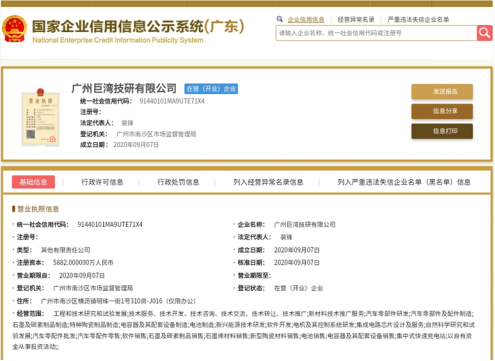 广汽首家内部孵化技术创新公司——巨湾技研有限公司注册成立