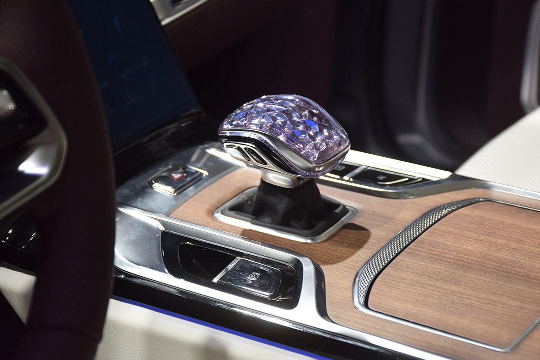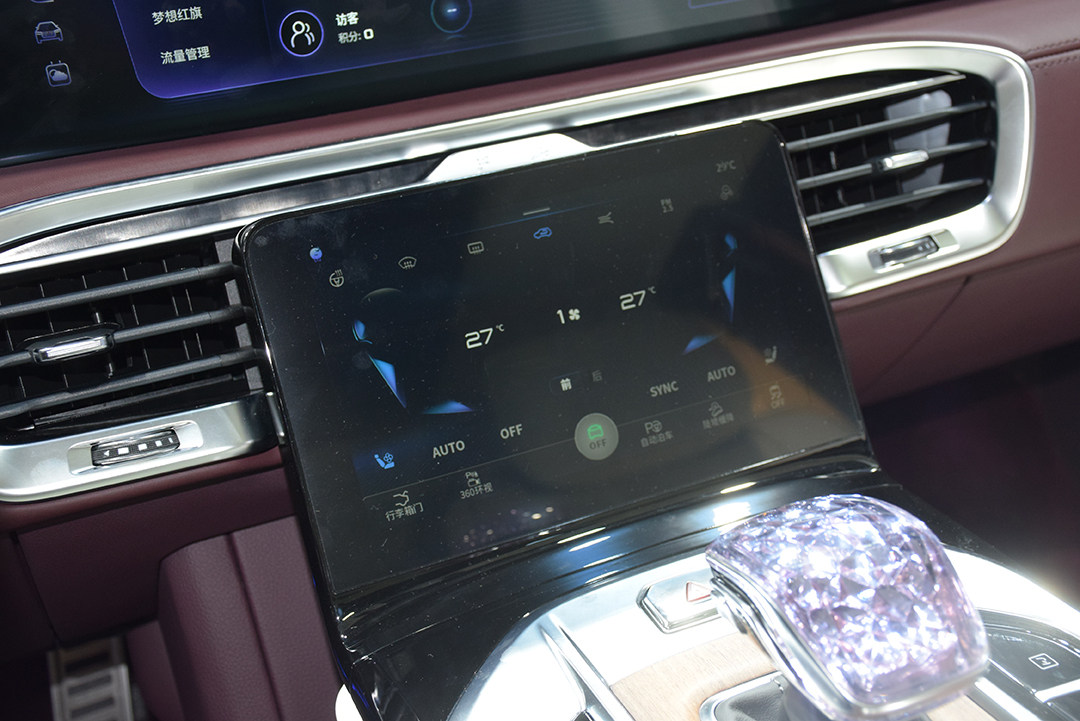 三辐式真皮方向盘尺寸不大,且造型很精致,方向盘两侧除了保留实体滚轮键之外,其余快捷功能键为触摸式,电子挡把也采用类似水晶的材质装饰,空调下方还设置了一块液晶屏,主要用于调节空调和座椅等。