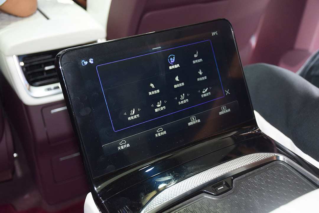 为了提供更加舒适的乘坐体验,车内每一张座椅都做得很宽厚,尤其驾驶位支持18向电动调节,第二排座椅支持通风、加热、按摩、腿托、半躺等功能,后排扶手箱前端还提供了一块触摸屏,可控制天窗开合、座椅按摩等。