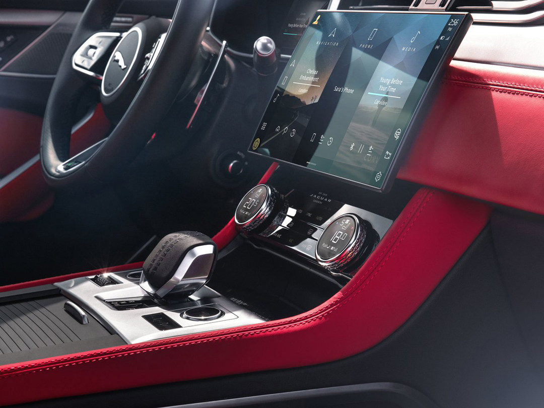 我们先从F-PACE变化最明显的内饰开始讲起,2021款F-PACE的内饰经过重新打造,使用对称式设计,通过不同材质、颜色的饰板去营造出中空调不一样的味道。从官图中看到,该车使用大量红色的皮革包裹,对于车辆的运动化氛围、驾驶员的肾上腺素有一定的刺激作用。