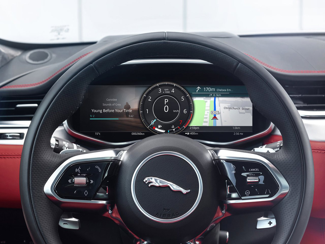 12.3英寸的全液晶仪表盘中央为发动机转速和车辆速度显示,两侧为多功能显示,这是不是有点法拉利的味道?方向盘也经过重新设计,如今的潮流是将气囊体积尽量最小化,这样看起来更加运动化些,而捷豹也深知这点,所以F-PACE的方向盘就是采用这种设计,搭配上换挡拨片以及触摸电容按钮,让你在驾驶时能享受到科技带来的变化。