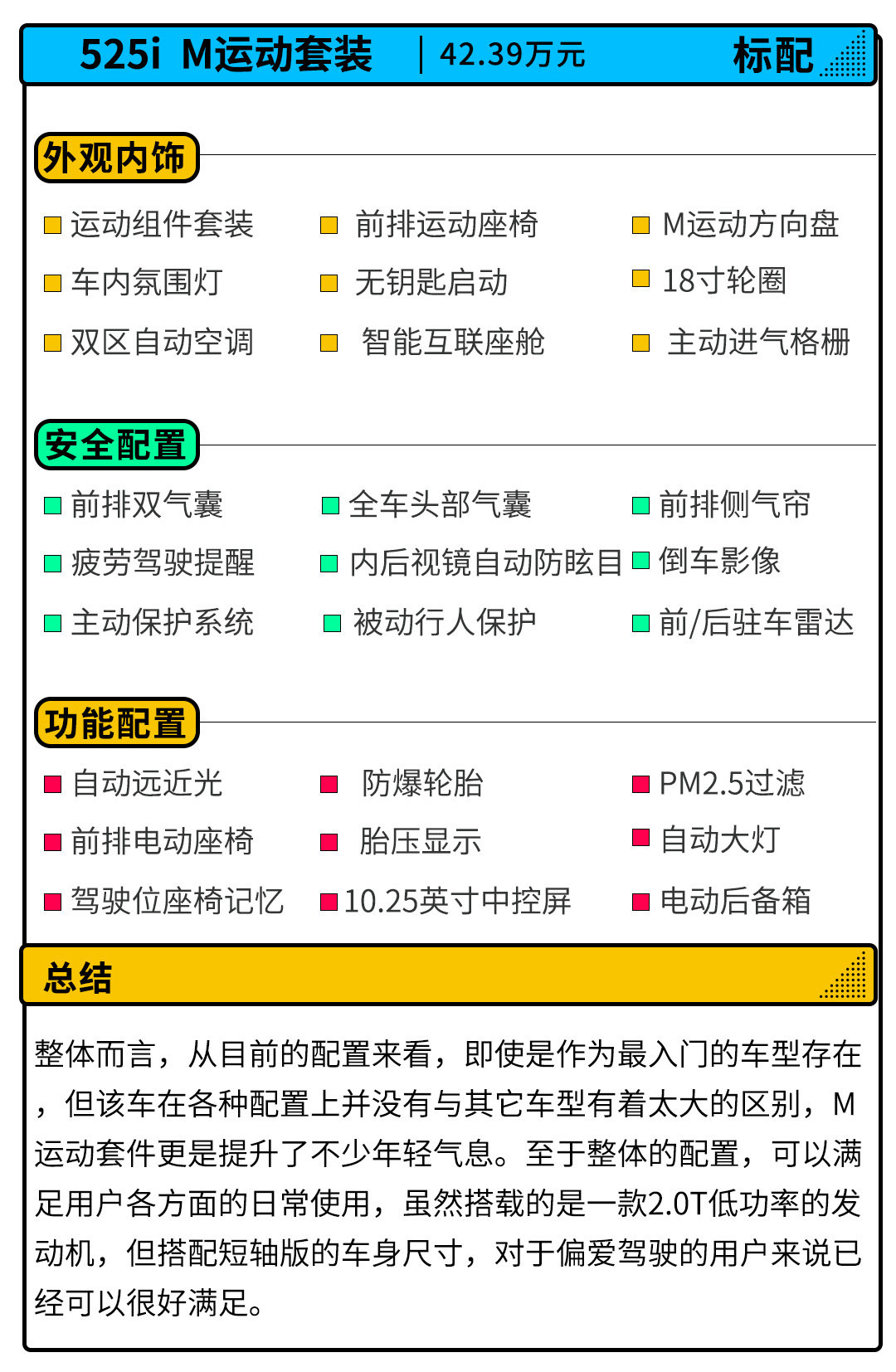 对于一款42.39万元的入门款车型来说,525i车型整体的配置也算是对得起自身的定位和售价,而且短轴版的车身很好满足偏爱驾驶的用户需求,对于一个更多情况下是一个人驾驶的消费者来说,其实这款车型已经足够了。