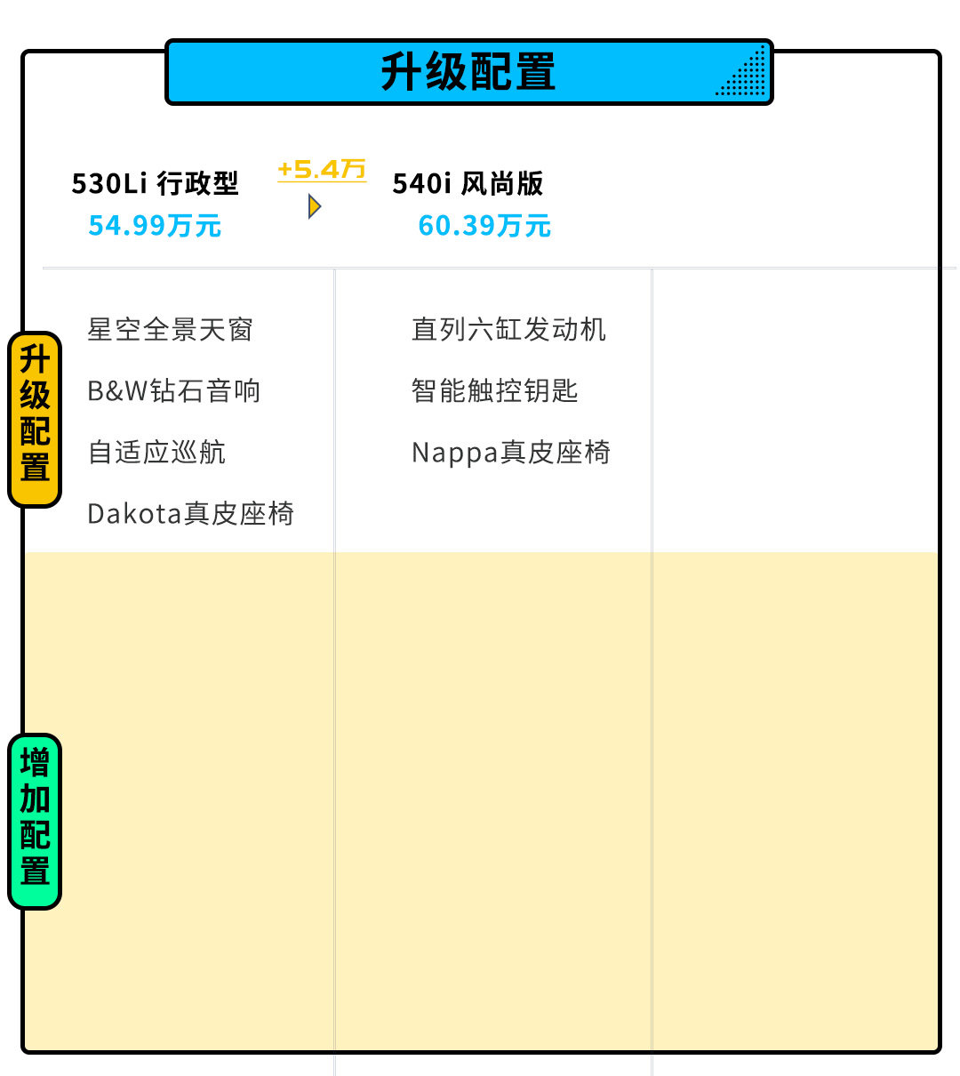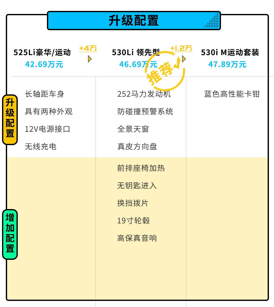 多加3000元,你能获的是长轴距车身,以及两种外观的选择,至于配置上则是增加了12V电源接口以及无线充电。但是,同时相比525i车型会缺失外后视镜防眩目。