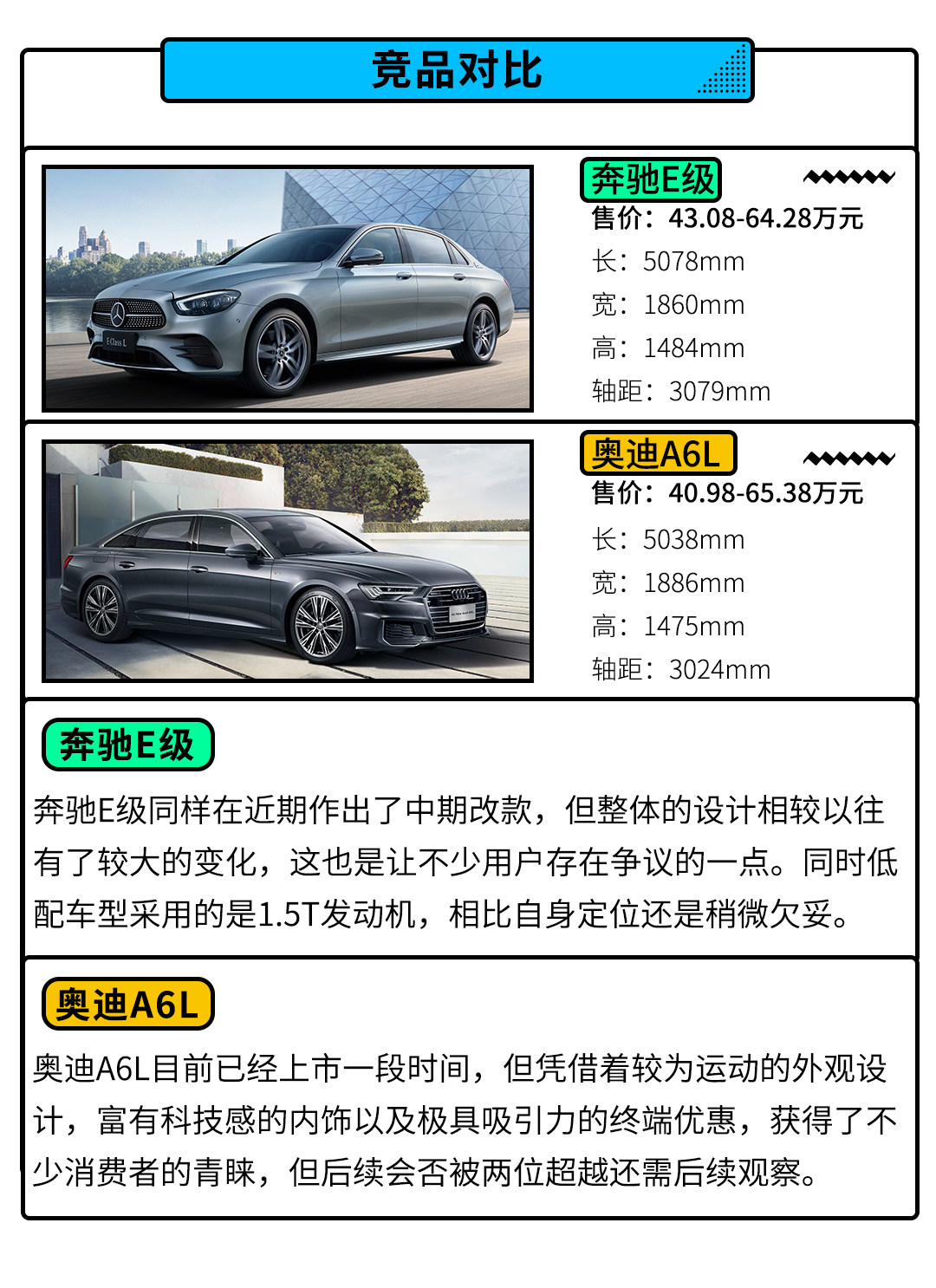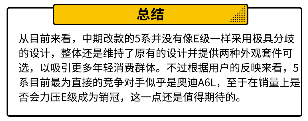 参照同级最主要的两位竞争对手,新款5系从目前来看还是非常具有竞争力的,而这也要感谢与对手E级作出的大胆设计。当然了,极具价格吸引的奥迪A6L也是不可忽视的,毕竟凭借整体的设计与配置,从上市以来就获得不少年轻用户的青睐。