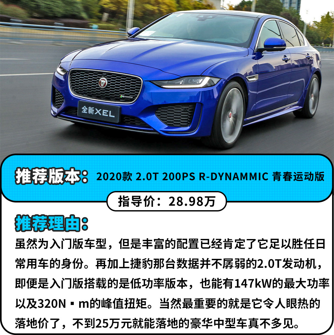 而像倒车影像、液晶仪表盘、分段天窗、换挡拨片以及主动安全系统等等实用配置,都做到了全系标配,这就很让人意外了;毕竟捷豹往常的风格为“一分钱一分货”,现款车型上的配置丰富已经开始颠覆捷豹原来的风格了。在这种丰富的标准配置下,哪款车型最值得购买呢?一起来看看。
