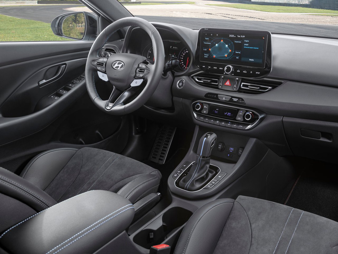 走进车内,i30 N的车内“一反常态”,中控台并没有类似红色缝线、饰条等一般彰显车辆运动属性的装饰,跟普通版本车型区别不大。虽然三辐式的方向盘样式出众,握感出色,但始终无法让人往性能车方向去联想,仅有在扶手箱,挡把、方向盘上有一丝蓝色的缝线装饰,稍稍显示出车辆的定位,整体车辆的运动化改造还需要更彻底一些。