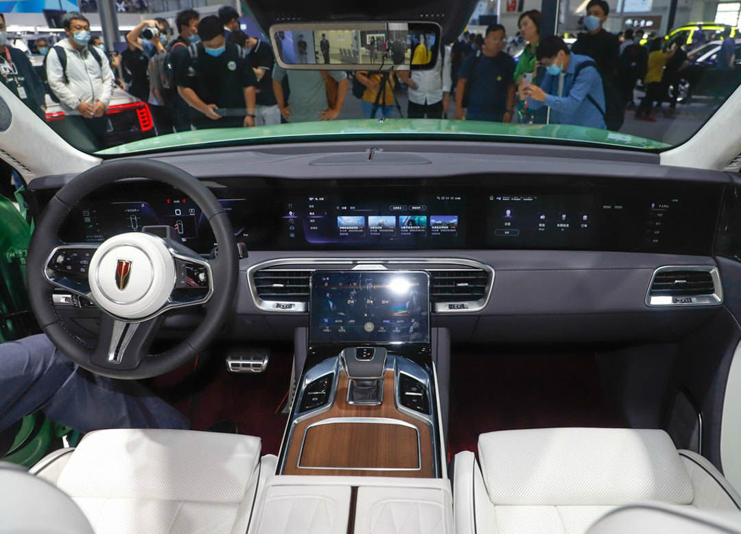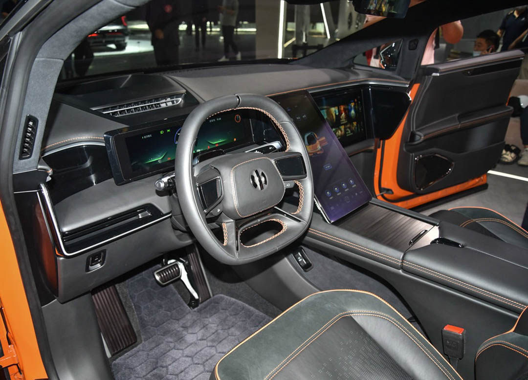 内饰延续了H9的T字形布局,不同的是中控台采用了三块贯穿式的屏幕设计,包括液晶仪表盘、触摸中控屏、副驾驶显示屏,下方独立摆放的是空调控制屏,科技感十分的强烈!座椅布局方面,提供了四座、六座、七座三种布局,其中四座版为高配车型,后排有独立座椅和显示屏,如同飞机头等舱一般!动力方面,高配车型采用前后双电机设计,并提供三种续航里程,但具体数据要等正式上市后才能知道。