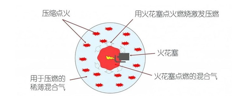 通过研究,工程师又发现,HCCI(均质混合气压缩点火,点火过程同柴油发动机相类似)除了能实现较高的压缩比和比热比,还能完全和快速地燃烧稀薄混合气,实现多点大面积同时压缩着火,没有传统火花塞点燃的火焰传播过程,所以压缩点火可以在极短的时间内完成燃烧放热,以提高发动机效率。