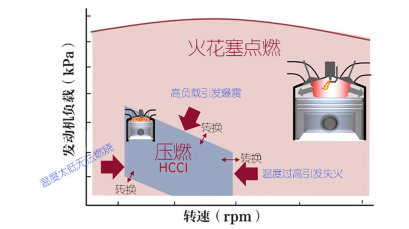 因为传统的火花塞点火和HCCI点火对缸内温度、空燃比等要求均不一样,在不同工况下,让发动机来回切换点火模式非常困难。