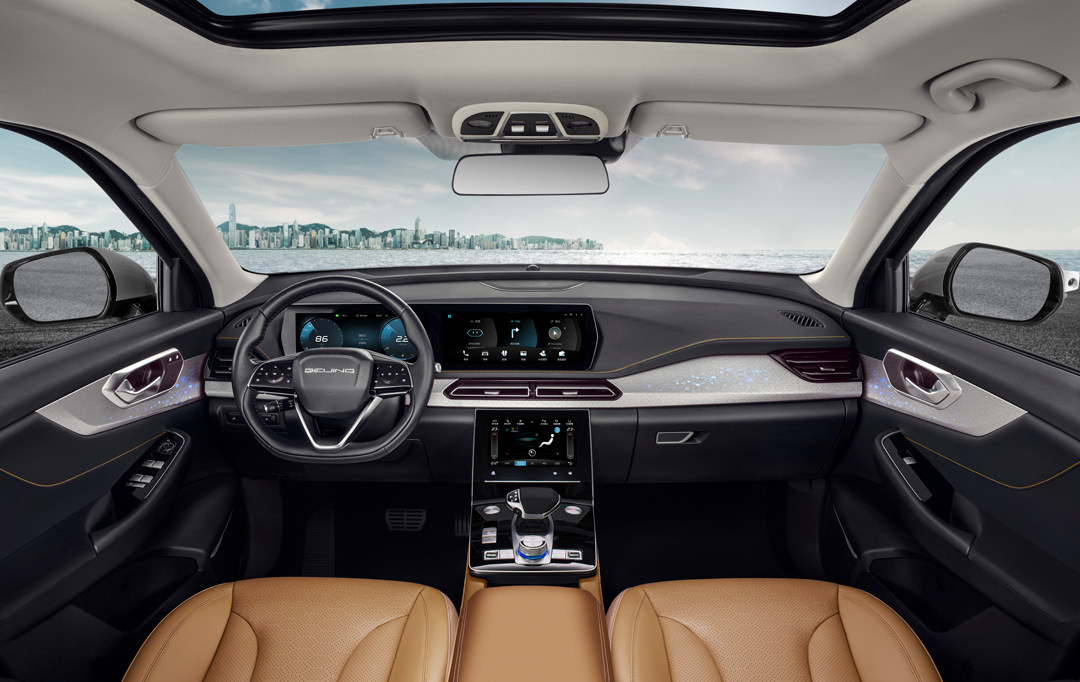 内饰在同级别当中也是非常难得的表现,由3块屏幕搭建起来浓浓的科技风,两块12.3英寸(高配)屏幕组合起来的贯穿设计,空调采用全触控屏控制,多功能方向盘也采用类触控式控制,繁杂元素不多,内饰氛围很有科技感,跟北汽以往的车型都很不一样。