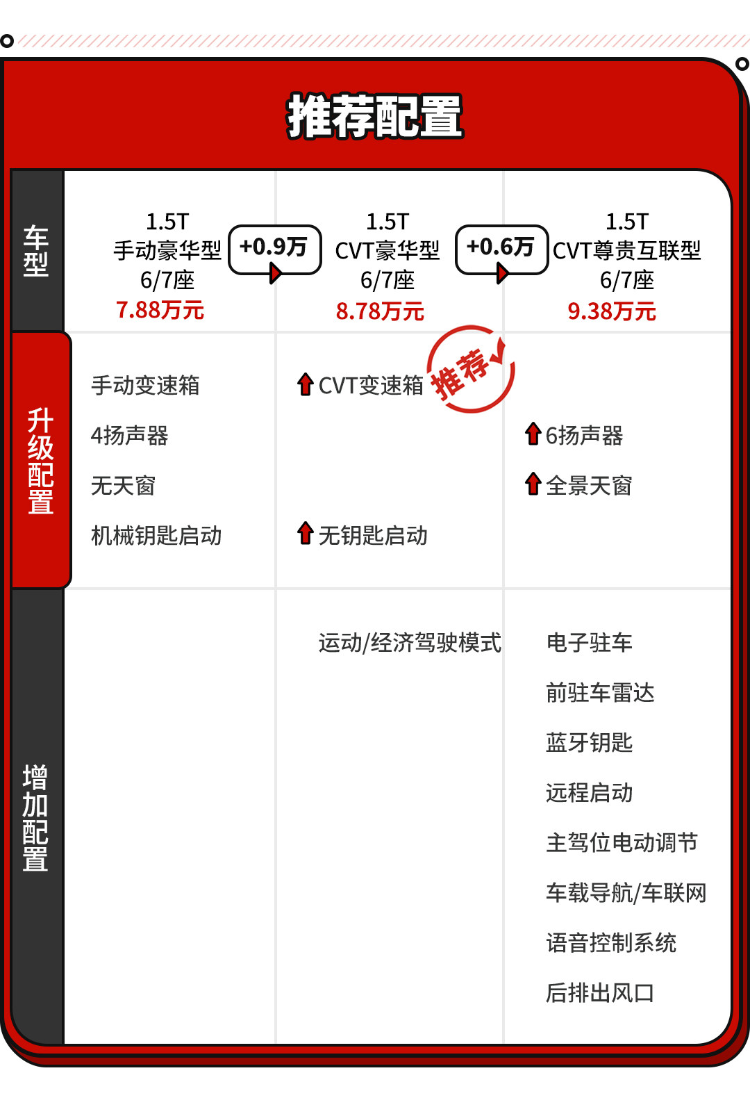 不过最值得推荐的是它的实用性,座椅布局有2+3的5座、2+2+2的6座以及2+3+2的7座多种选择,车身长达4690毫米轴距2750毫米,为车内空间提供充足的余量;配备1.8L和1.5T两款发动机,手动/CVT/AMT/双离合多种动力总成可选,适合不同用户的用车场景,可家用可拉货。