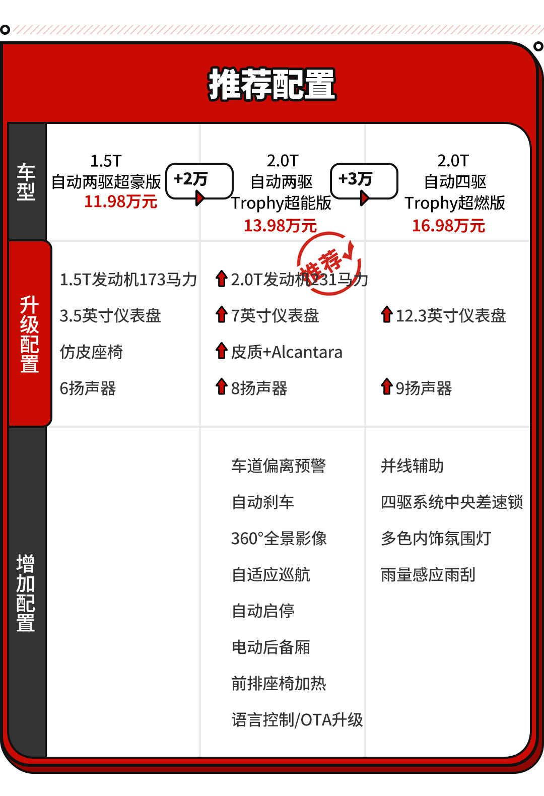 内饰比较简约,通过大面积的皮质包裹营造出饱满的动感,整个设计风格有点像是欧洲跑车,三辐式方向盘更是配备了“超级运动模式”,红色按钮跟法拉利保时捷有异曲同工之妙,Trophy更是配备了一体式运动座椅,红色内饰更是让内饰运动氛围达到高潮,同级别中少有如此激进的内饰。