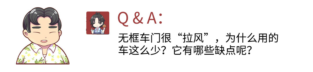 一个无情的事实是,搭载无边框车门的车,例如最美大众车之称的大众CC,销量可不咋的。而无边框车门,一般是应用在跑车或者一些少见的性能车型上,一般的家用车就很难见到,这与它的一些缺点是息息相关的。