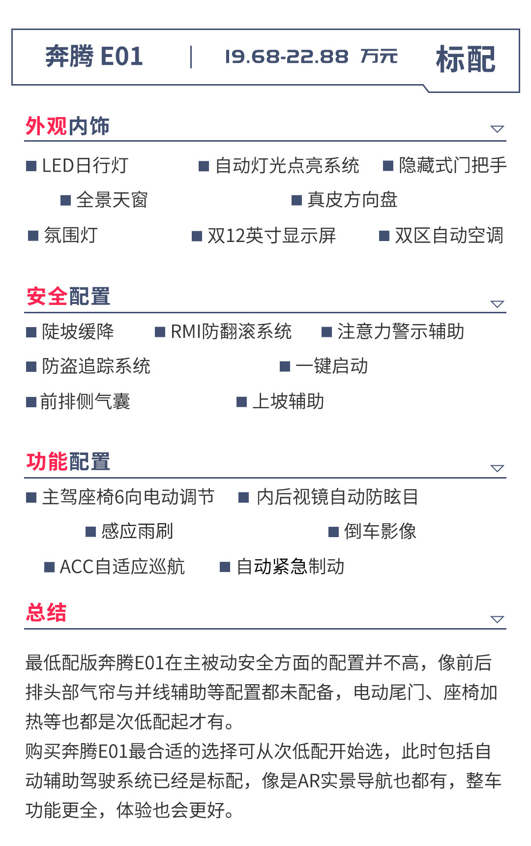 另外,次低配的奔腾E01已经搭载了驾驶辅助系统,能够实现并线辅助、车道偏离预警和交通标识识别等功能,这正好是竞品所不具备的,所以,想要长续航还是自动辅助驾驶系统,取决于消费者购车时用车需求的侧重点了。