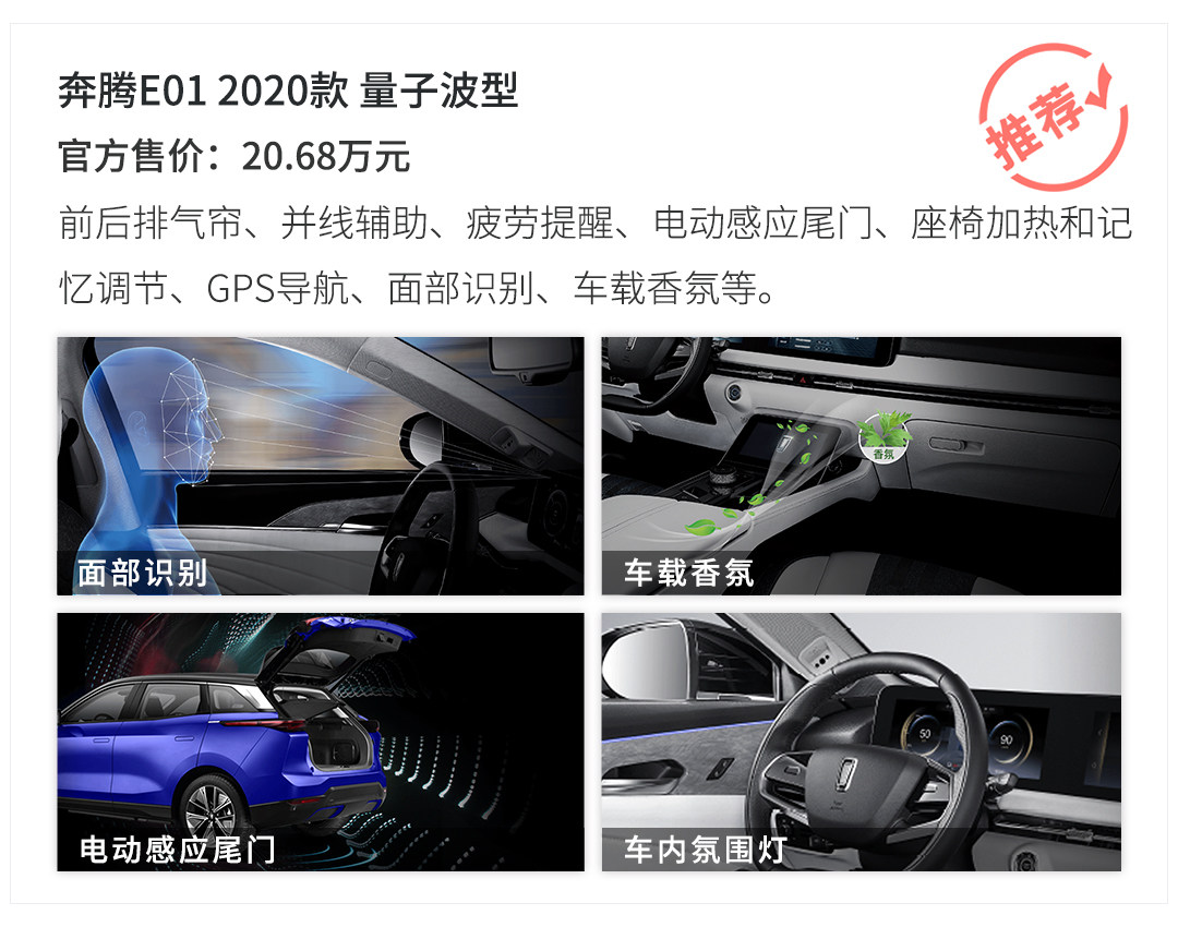 奔腾E01已经正式上市销售,共推出5款车型,售价区间为19.68-22.88万元,车型定位中型SUV。另外,奔腾E01还提供电池租赁计划,选择无忧租的用户车价立减10万,还能享受电池至高5年免息服务。