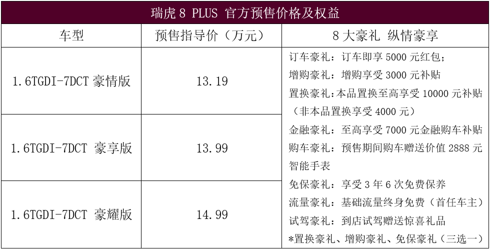 瑞虎8 PLUS的每一处匠心所至,都为豪装赋予了崭新的内涵。活动现场公布了瑞虎8 PLUS 1.6TGDI-7DCT三款车型的预售价格,其中,豪情版13.19万元、豪享版13.99万元、豪耀版14.99万元。为了让广大消费者更轻松地拥有瑞虎8 PLUS,奇瑞汽车更特推出了“8大豪礼 纵情豪享”多重购车礼遇。