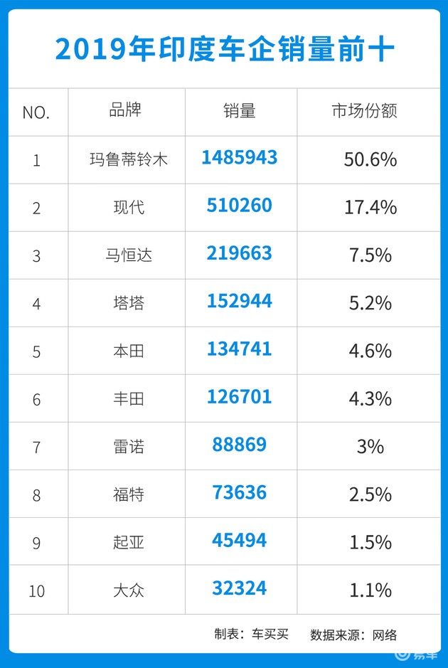 印度汽车市场几近被铃木、现代所瓜分,两者市场份额分别达到了50.60%、17.4%,这压迫了印度汽车品牌的发展,作为最大的本土汽车厂家,第一份额的马恒达不过是219,663辆;第二的塔塔集团在2019年只有152,944辆的销量,勉强接近第一的玛鲁蒂铃木的1/10。并且需要注意的是,马恒达主营还是农业载具、商用车,与家庭用户没有太大的关系。