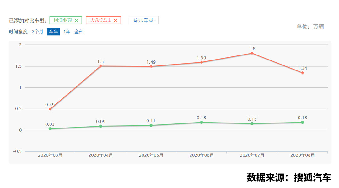 以柯迪亚克为例,车辆与大众途观L属于同平台产品,虽然是“大众换壳”,但其销量对比途观L却差之千里。根据数据显示,柯迪亚克8月销量仅有1785辆,而同月途观L销量却高达13397辆,柯迪亚克的销量还不及途观L的一个零头。