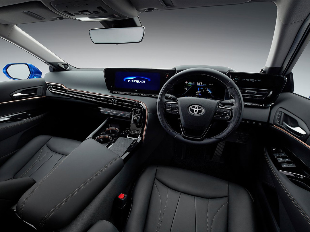 第二代丰田Mirai的氢能工作原理是这样的,通过电解水制氢,再把氢气加入车内发生化学反应驱动电机为车提供动力。所以在丰田Mirai 身上取消掉了传统的内燃机和大面积的邮箱部件,只剩下了动力电池,电机,动力控制单元以及燃料电池堆栈器(便是氧气与氢气反应燃烧的地方),还有储氢罐等主要核心部件。