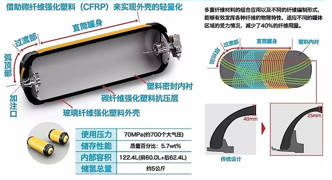 丰田在存储氢能上做了很多努力,其储氢罐被设计成四层结构,铝合金的罐体内部衬有塑料内胆,外面包裹一层碳纤维强化塑料的保护层,其外侧再增加一层玻璃纤维材料所制成的减震保护层,并且每一层的纤维纹路都根据所处罐身位置不同而做了额外的优化,使纤维顺着压力分布的方向,提升保护层的效果。