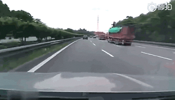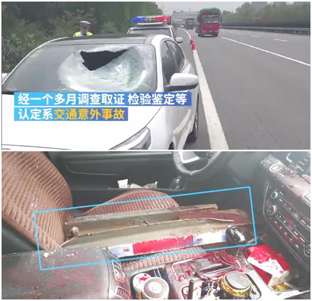 上图的这起事故的起因是,一辆在前面行驶的货车尾部立柱松动,跌落在了高速公路上。视频车与前车正常驾驶,但前车避让不及压到了这块钢制立柱,轮胎的弹力以及动力势能导致这块钢制立柱向后弹射。不幸的是,视频车就在这块钢制立柱的“弹道”上,击中视频车的钢制立柱,不仅击穿了视频车的挡风玻璃,更是导致副驾驶伤重不治离世。