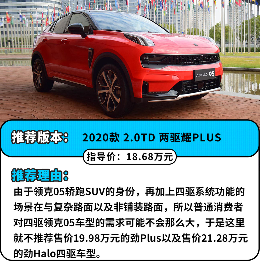 虽然说入门版的领克05已经能够为消费者提供一个较为舒适的驾乘环境,但在5款车型中自然也存在着最具性价比的一款,买买君认为它就是次低配的耀PLUS车型,首先是因为领克05车型的标准配置已经足够丰富,耀PLUS车型的配置更是不错,下一档贵了1.3万元的车型只是多了些实用性不强的舒适性配置而已,属于可有可无的需求。