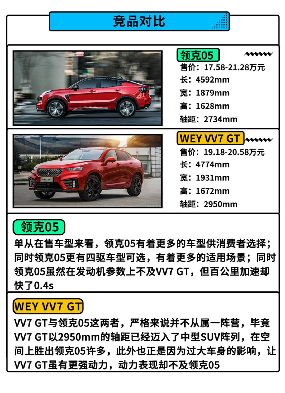 其次就是与同级别对手之间,05并不能拉开明显的趋势,作为自主豪华品牌旗下的轿跑SUV车型,再联系到其售价,领克05的对手已经呼之欲出,那便是WEY的VV7 GT。可以看到,与VV7 GT相比,领克05的确有着不少亮点,但从这其中我们也能发现它的一些硬伤,首先就是这个17.58-21.28万元的售价,作为一个新兴品牌,这个售价无疑是比较激进的。