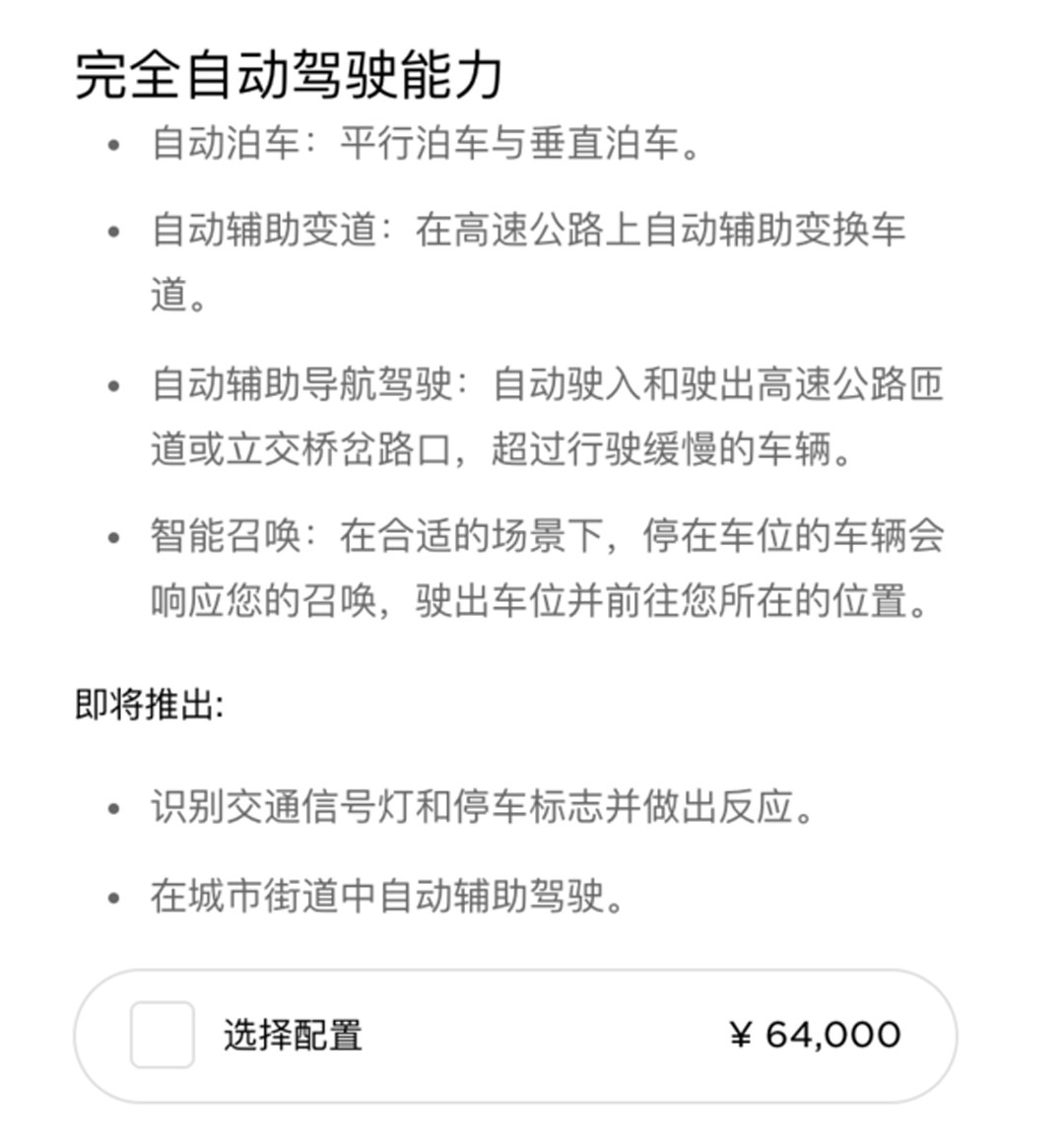 3、FSD,这是最最典型的付费升级内容,目前新车标配基础版Auto Pilot功能,只有车道保持以及ACC自适应巡航功能,要升级到FSD,需额外支付64000元。