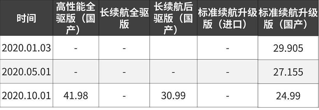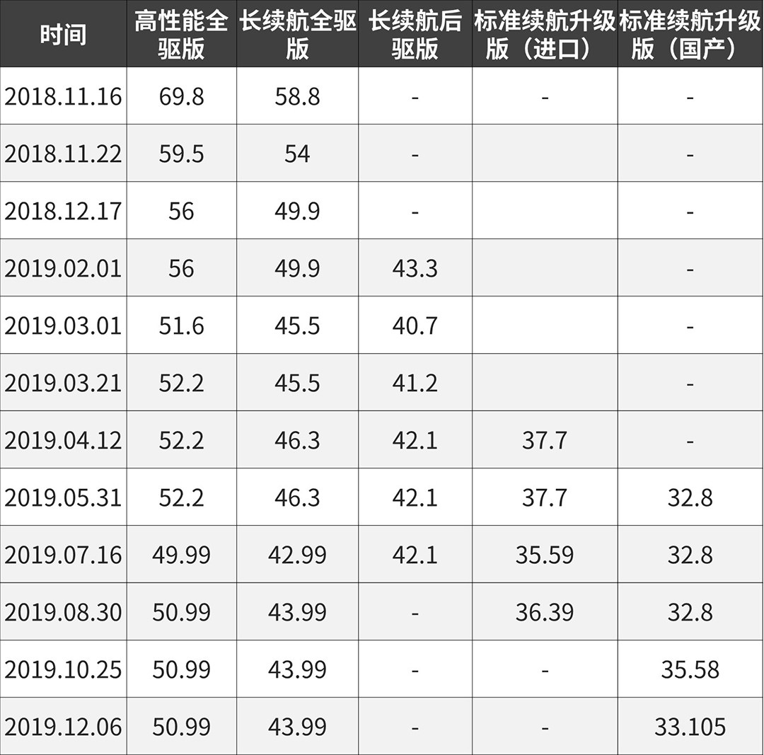 2018年11月,进口版Model 3在广州车展上正式公布售价,先期引入两个版本,其中长续航全驱版基础售价为58.80万元,高性能全驱版基础售价69.80万元,随后便经历多达5次降价。2019年5月31日,国产Model 3正式公布价格:32.8万元;同年12月6日,获得国家补贴,价格下降至33.105万元;2020年1月3日,下降至29.905万元。