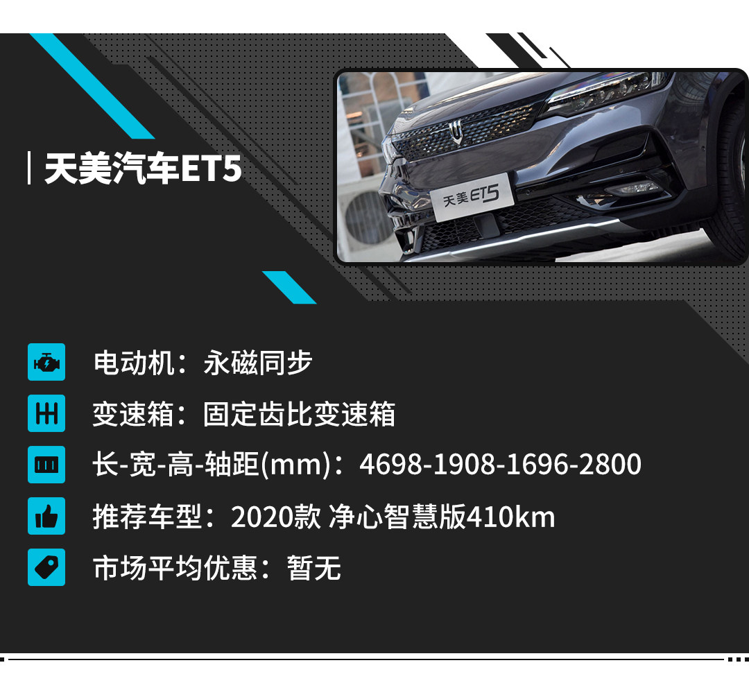 就车型丰富度来讲,天美ET5相比同级别的比亚迪唐新能源、广汽新能源Aion LX,用户可选余地不多,但从另外的角度来看,车型不多,大大降低了用户的购车选择难度。