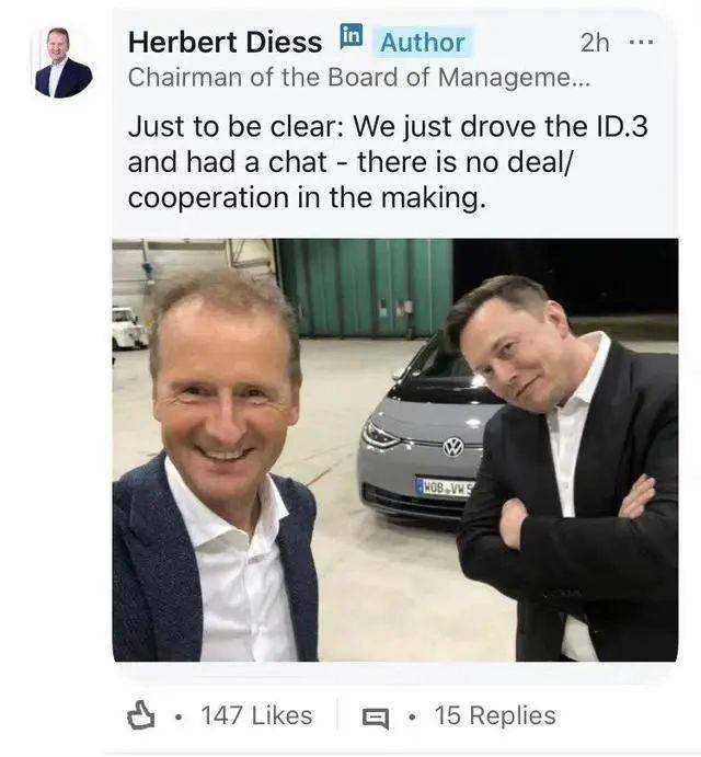 而两人的会面也引发了外界对于双方合作的猜想,包括电池研发、自动驾驶技术、平台等方面双方是否已经达成合作协议。不过随后迪斯就在社交媒体澄清,二人的会面只是私人性质,没有涉及协议和合作。