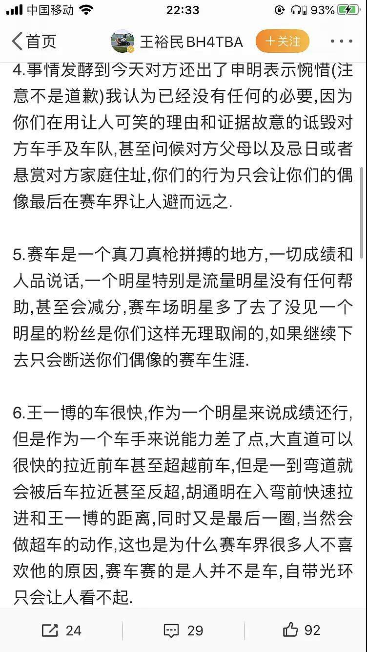 事后,一些不明真相也不懂赛车规则的王一博粉丝们,针对这次事故对另一位车手进行了“网络攻击”。觉得对方不应该进行超车、摔车是为了故意碰撞、碰撞后没有先问下对手是否有事等等,反正就认为都是对手的问题。