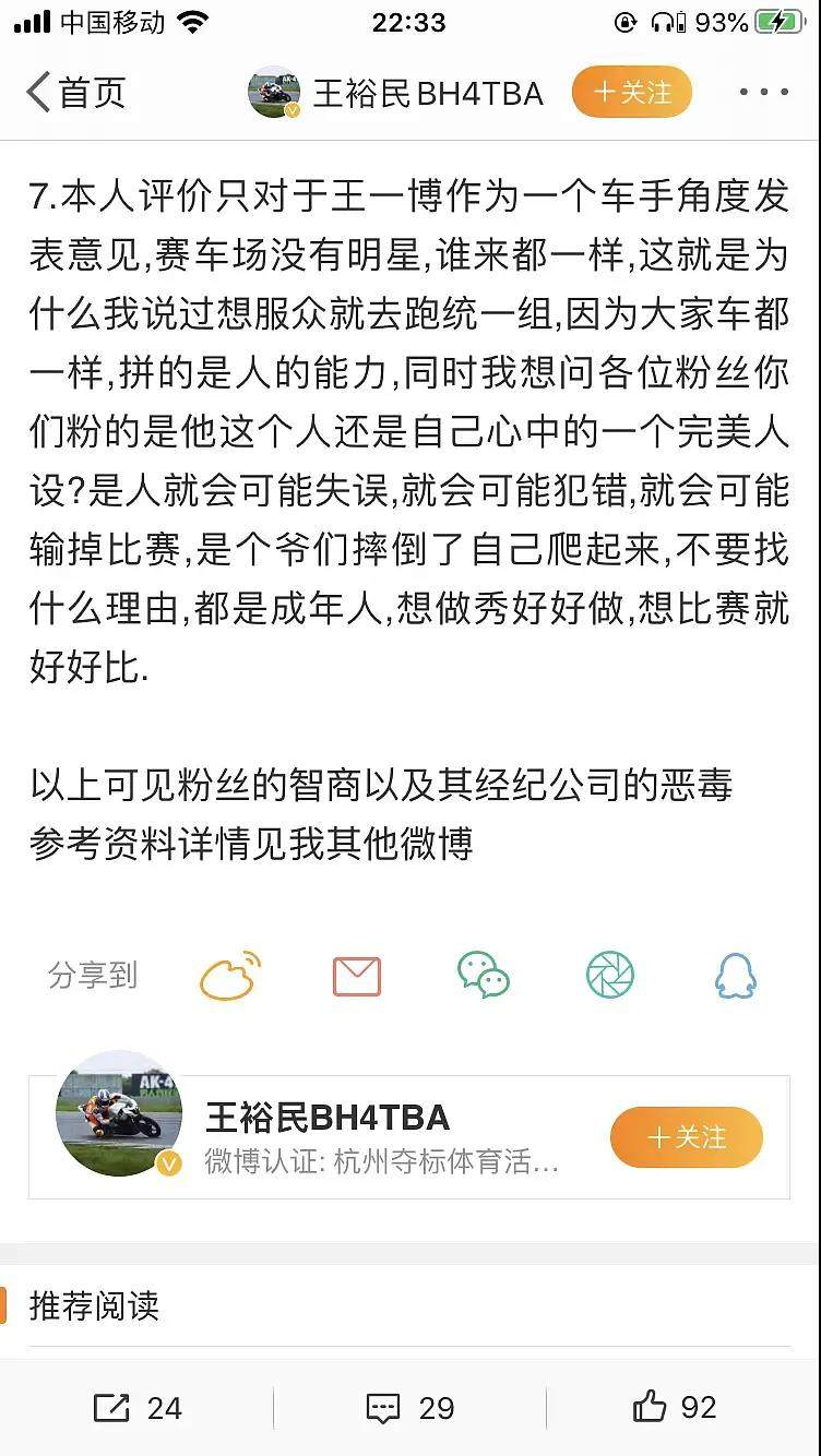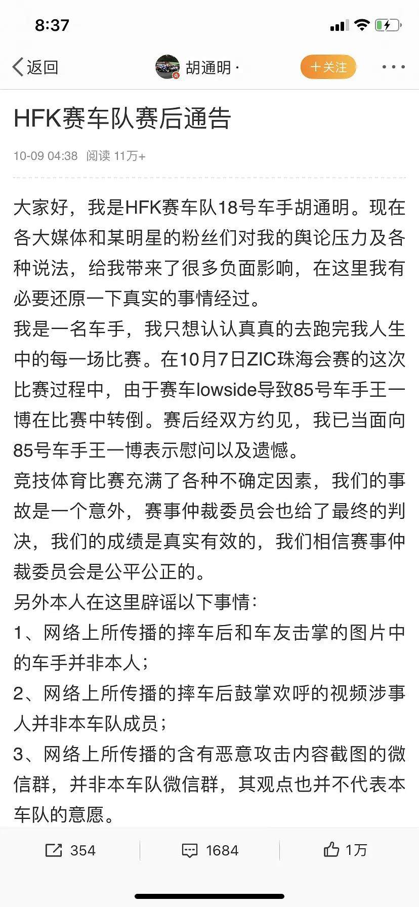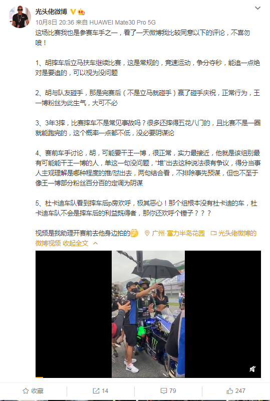 随后,车手更是发了一条对于此次事故感慨的微博,大概意思就是:你们别骂了,我来骂吧,同时还要遵守体育精神。