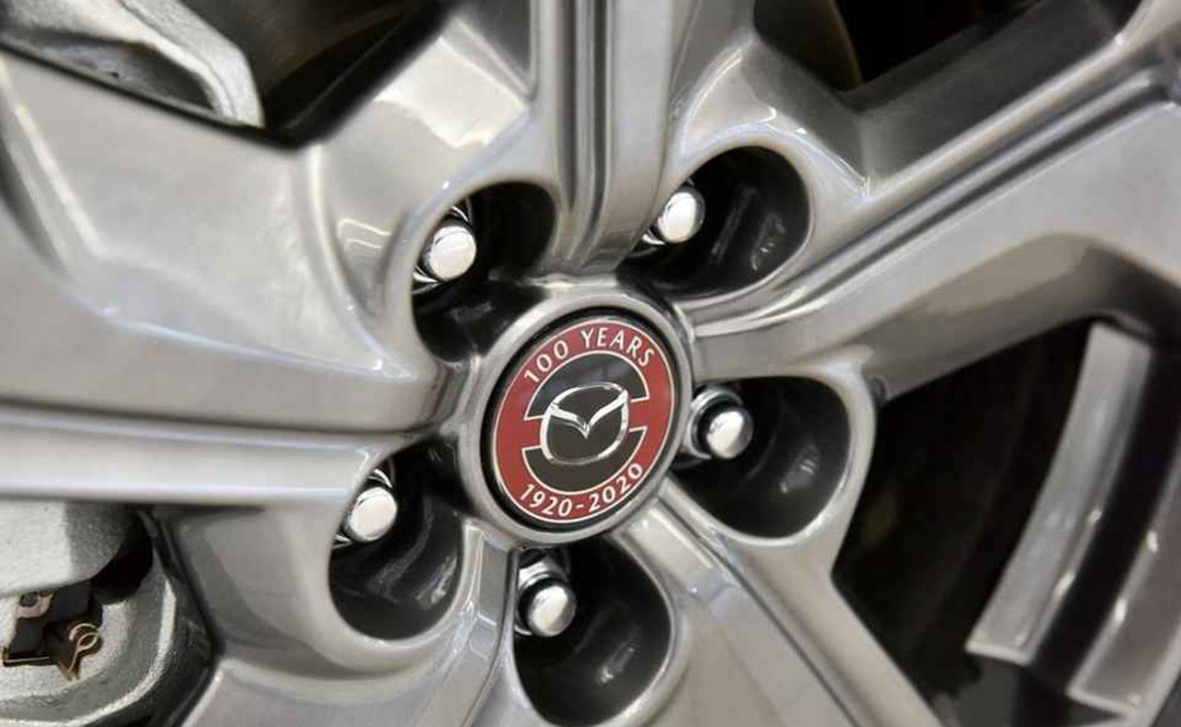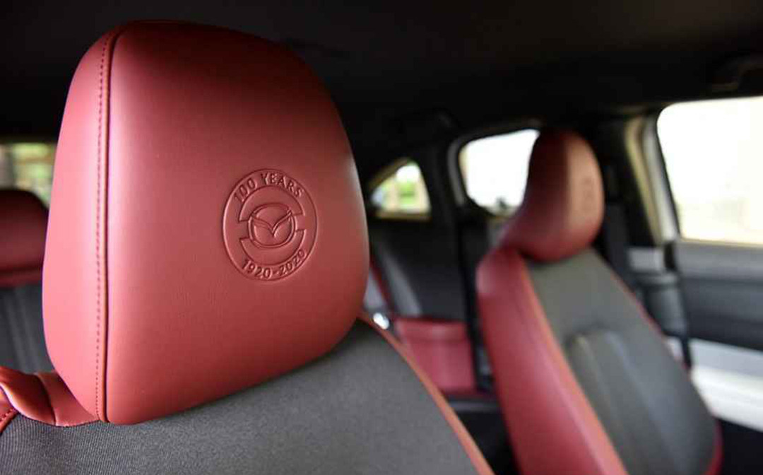 马自达百年纪念版MX-30采用主体白色,车顶红色的撞色设计,并且在车身上添加了不少独特的纪念版元素,例如轮毂和座椅头枕上的圆形LOGO和“100 YEARS 1920-2020”的铭牌等。
