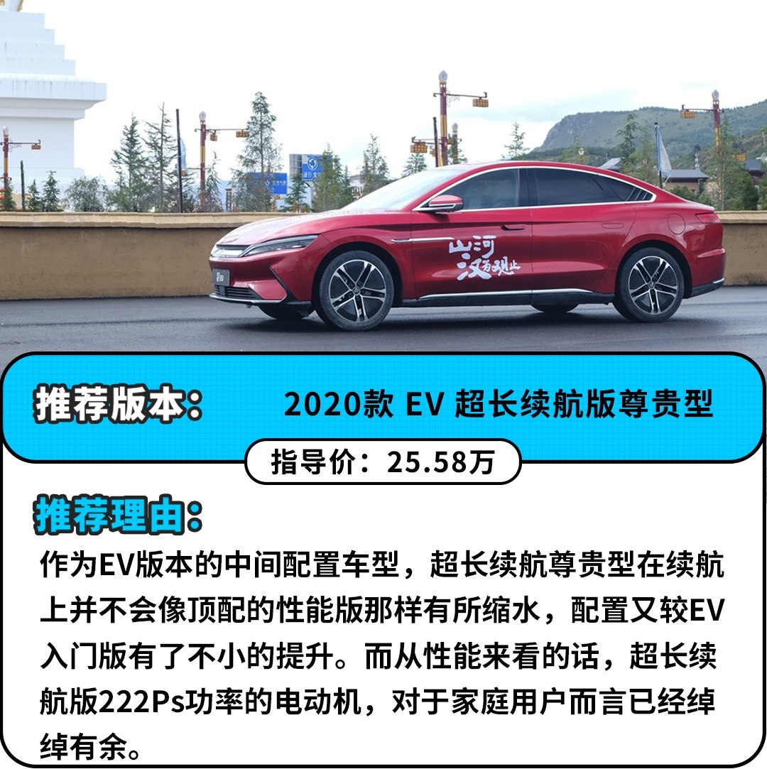 而汉在内饰上更是有了很大的长进,与比亚迪的以往车型相比,汉采用了左右对称的环抱式设计,新样式的中控台区域以及方向盘又塑造了较强的立体感,同时大面积的真皮包裹也让汉的内部氛围与质感有了很大提升。所以综合而言,在20万价位里,汉EV作为纯电车型的话还是有着其独一无二的优势。那么汉EV的三款车型中,哪款车型又最值得购买呢?