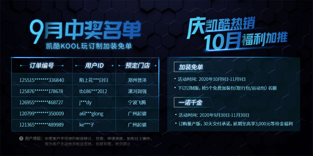 获奖名单来了,快来看看有没有你!自上市以来,K5凯酷以一款真正的全球车实力和极具差异化的超值服务,成为年轻人的“心头好”,并在沉闷已久的B级车市场掀起供不应求、上市即热销的抢购热潮。近日,K5凯酷为9月份订购KOOL玩订制款车型的用户抽取加装免单礼,首期获奖名单已出炉,5位幸运车主获得价值3000元的“免费加装包”惊喜。