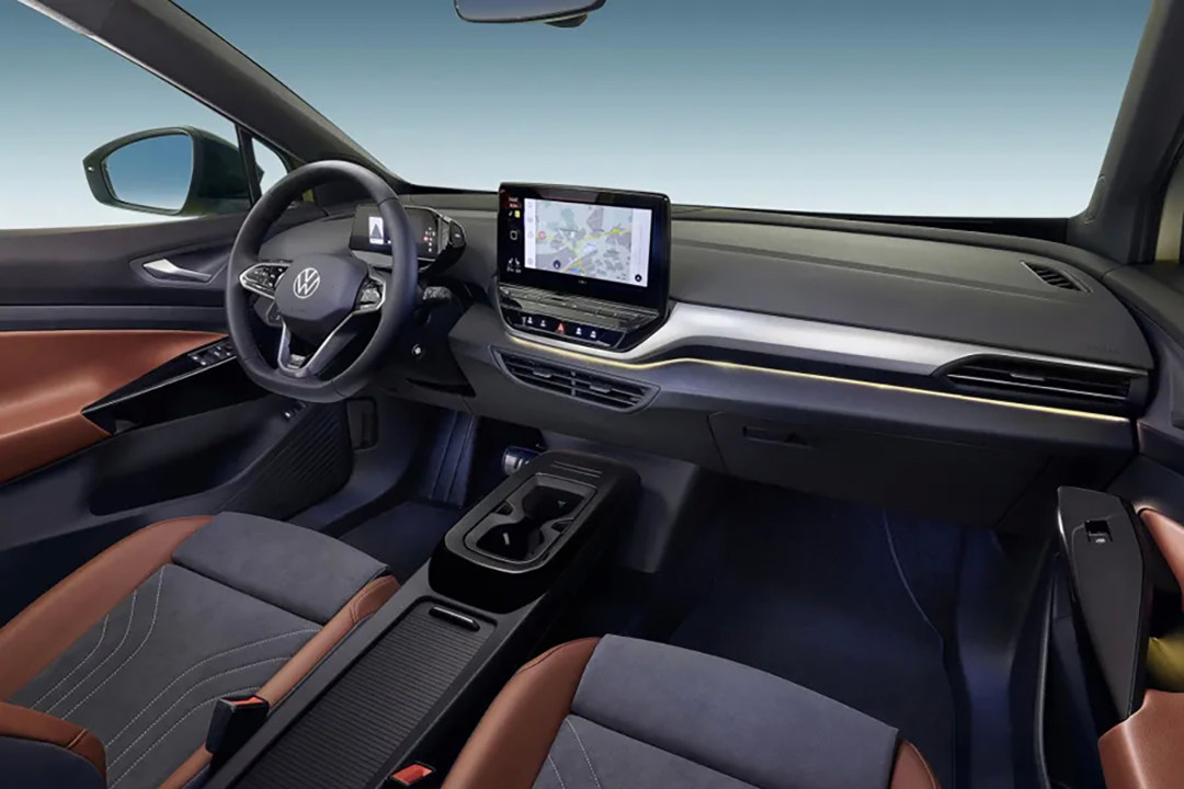 海外版ID.4和国产版外观一致,扁平化设计的全新品牌标识及封闭式进气格栅,搭配炯炯有神的两侧前大灯通过细长的LED灯带相连接,再加上蜂窝造型的前保险杠,整体极具辨识度。ID.4的内饰沿用的是ID.3的简洁设计,值得一提的是ID.4的挡把设置在液晶仪表盘旁边,换挡需要旋转挡把完成。