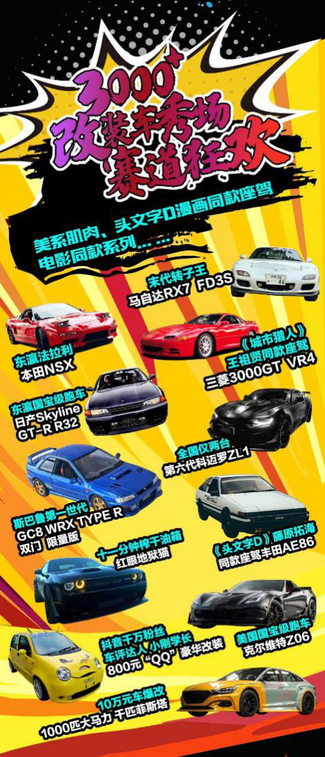 更有小刚学长法拉利电瓶加持的800元QQ爆改、网红雪糕车、10万元车爆改1000匹菲斯、90年代经典本田和斯巴鲁等等。